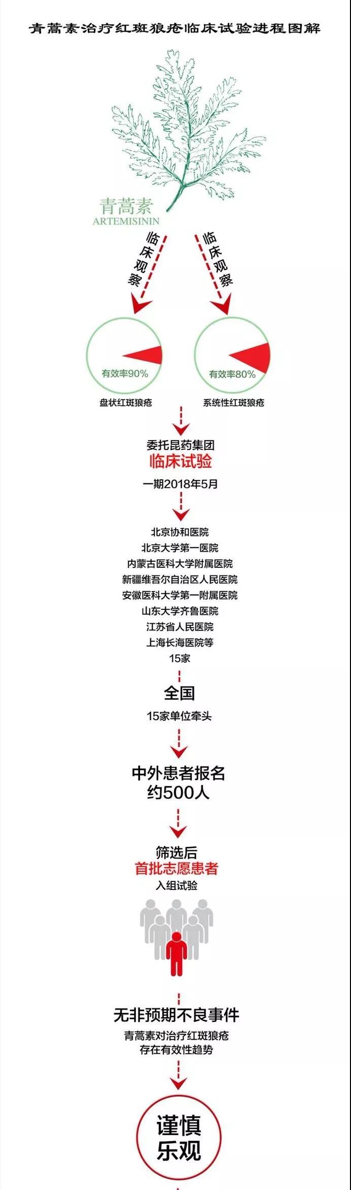 20185月,双氢青蒿素片新适应症红斑狼疮临床试验一期正式启动,设计样本共120例,由北京协和医院、北京大学第一医院、内蒙古医科大学附属医院、新疆维吾尔自治区人民医院、安徽医科大学第一附属医院、山东大学齐鲁医院等全国15家牵头单位共同参与开展。