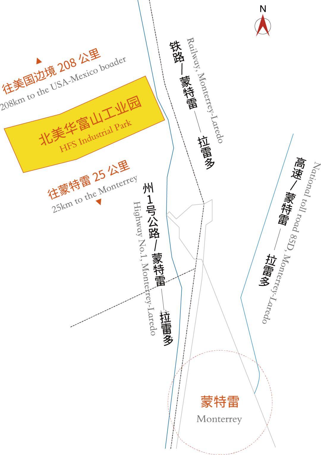 在墨西哥北部新莱昂州首府蒙特雷市以北28公里,坐落着北美华富山工业园(HOFUSAN)。工业园占地8.5平方公里,距墨美边境美国一侧口岸新拉雷多市仅200公里,紧邻国家高速公路和货运铁路干线,连接各主要货运目的地。
