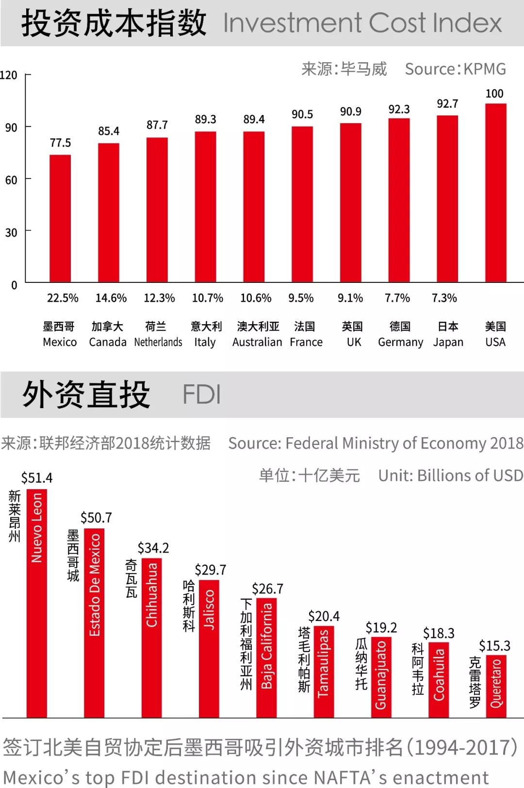 数据显示,当前中国对拉美的直接投资存量超过2000亿美元,而中国对墨直接投资仅为8.6亿美元。随着中美贸易摩擦升级,许多销往北美市场的中国商品面临被加收关税的威胁。原本直接出口墨西哥的汽车零部件等产品,未来也可能因为美国威胁修改北美自贸协定中的原产地规则,而被设置贸易壁垒。贸易摩擦所带来的不确定性,从某个角度看反而为进入墨西哥的投资提供机遇。